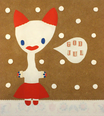 my ambition this year was to do all my Christmas shopping at the flea...so far I did not succeed. the only thing I have found is a number of old catalogues with fabric samples whitch happend to be perfect outfits for my cats...so now I cut, I glue, I paint day and night. I think they will be Christmas gifts for the children in the family...and as you can see in the picture: lots of samples left and I enjoy this...